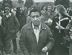 By 1965, Chavez was aware that the numbers joining the picket lines had declined; although hundreds of pickers had initially struck, some had returned to their jobs, found employment elsewhere, or moved away from Delano. To keep the pickets going, Chavez invited left-wing activists from elsewhere to join them; many, particularly university students, came from the San Francisco Bay Area.[111] Recruitment was fueled by coverage of the strike in the SNCC's newspaper, The Movement, and the Marxist People's World newspaper.[112] By late fall 1966, a protest camp had formed in Delano, opening its own medical clinic and children's nursery.[113] Protesters were entertained by Luis Valdez's El Teatro Campesino, which put on skits with a political message.[114] Within the protest movement there were some tensions between the striking farm-workers and the influx of student radicals.[113]