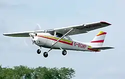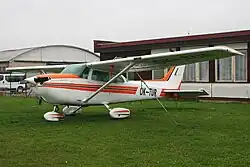 The Cessna 172 Skyhawk is an American four-seat, single-engine, high wing, fixed-wing aircraft made by the Cessna Aircraft Company.[2] First flown in 1955,[2] more 172s have been built than any other aircraft.[3] It was developed from the 1948 Cessna 170 but with tricycle landing gear rather than conventional landing gear. The Skyhawk name was originally used for a trim package, but was later applied to all standard-production 172 aircraft, while some upgraded versions were marketed as the Cutlass, Powermatic, and Hawk XP. The aircraft was also produced under license in France by Reims Aviation, which marketed upgraded versions as the Reims Rocket.