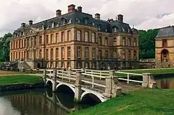 Built by Jules Hardouin-Mansart, 1675–1683 for the duc de Chevreuse, Colbert's son-in-law, the Château de Dampierre is a French Baroque château of manageable size. Protected behind fine wrought iron double gates, the main block and its outbuildings (corps de logis), linked by balustrades, are ranged symmetrically around a dry paved and gravelled cour d'honneur. Behind, the central axis is extended between the former parterres, now mown hay. The park with formally shaped water was laid out by André Le Notre.[12]