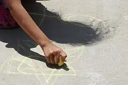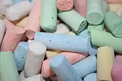 Coloured chalks, pastel chalks, and sidewalk chalk (shaped into larger sticks and often coloured), used to draw on sidewalks, streets, and driveways, are primarily made of gypsum rather than calcium carbonate chalk.[21]