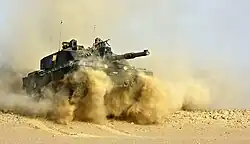 ![]() A Challenger 2 tank patrolling outside Basra, Iraq, during Operation Telic, 2004 | |