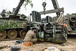 - Engine: Perkins 26.1 litre, 60° vee, twin turbocharged, CV12-6A four-stroke, four-valve-per-cylinder (pushrod), direct-injection diesel engine delivering 1,200 bhp (890 kW) at 2300 rpm. Torque 4126 Nm at 1700 rpm.[54] The engine and gearbox are controlled by a Petards Vehicle Integrated Control System (VICS).[55]