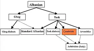 - ^ a b Shkurtaj, Gjovalin (2005). "The dialectological and ethno-linguistic values of the language of Chameria". In Bashkim Kuçuku (ed.). The Cham Issue and the European Integration (in English and Albanian). Tirana, Albania: "Arbëria" Publishing House. pp. 242–245. ISBN 9789994368822.