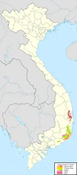 The Chams descended from seafaring settlers who reached the Southeast Asian mainland from Borneo about the time of the Sa Huỳnh culture between 1000 BC and AD 200, the predecessor of the Cham kingdom.[30] The Cham language is part of the Austronesian family. According to one study, Cham is related most closely to modern Acehnese in northern Sumatra.[31]