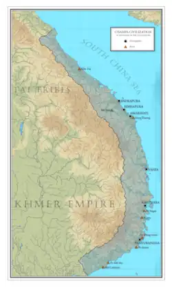 Champa (Cham: ꨌꩌꨛꨩ, چمڤا; Khmer: ចាម្ប៉ា; Vietnamese: Chiêm Thành 占城 or Chiêm Bà 占婆; modern Vietnamese Chăm Pa) was a collection of independent Cham polities that extended across the coast of what is present-day central and southern Vietnam from approximately the 2nd century AD until 1832.[4]