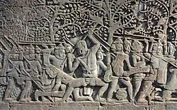 The twelfth century in Champa is defined by constant social upheavals and warfare, Khmer invasions were frequent. The Khmer Empire conquered Northern Champa in 1145, but were quickly repulsed by king Jaya Harivarman I (r. 1148–1167).[77] Another Angkorian invasion of Champa led by Suryavarman II in summer 1150 also was quickly stalled, and Suryavarman died en route.[78][79] Champa then plummeted into an eleven-year civil war between Jaya Harivarman and his oppositions, which resulted in Champa reunifying under Jaya Harivarman by 1161.[80][81] After having restored the kingdom and its prosperity, in June 1177 Jaya Indravarman IV (r. 1167–1192) launched a surprise naval assault on Angkor, capital of Cambodia, plundering it, slaying the Khmer king, leading to a Cham occupation of Cambodia for the next four years.[82][83] Jayavarman VII of Angkor launched several counterattack campaigns in the 1190s (1190, 1192, 1194–1195, 1198–1203), conquering Champa and making it a dependency of the Khmer Empire for 30 years.[84][85][86][87]