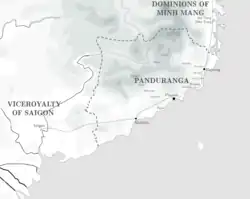 The last remaining principality of Champa, Panduranga, survived until August 1832, when Minh Mang of Vietnam began his purge against rival Le Van Duyet's faction, and accused the Cham leaders of supporting Duyet.[108] Minh Mang ordered the last Cham king Po Phaok The and the viceroy Po Dhar Kaok to be arrested in Hue, whilst incorporating the last remnants of Champa into what are the Ninh Thuan and Binh Thuan provinces.[109][110][111]