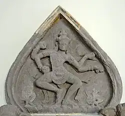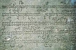 The King of Champa is the title ruler of Champa. Champa rulers often use two Hinduist style titles: raja-di-raja (राजाधिराजः "raja of rajas" or king of kings: written here in Devanagari since the Cham used their own Cham script)[123] or pu po tana raya ("lord of all territories").[124] They would be addressed by style ganreh patrai (his Majesty). Officially, the king was the patron of art and construction. Majestic temples and shrines were built dedicated to the honor of the king of kings, his ancestors, and their beloved gods (usually Śiva). Some charismatic Cham kings declared themselves Protector of Champa in celebrating royal ceremony and coronation (abhiseka) which involves supernatural and spiritual rituals to demonstrate the king's authority.[125]