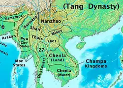 According to earliest historical references found in ancient sources, the first Cham polities were established around the 2nd to 3rd centuries AD, in the wake of Khu Liên's rebellion against the rule of China's Eastern Han dynasty, and lasted until when the final remaining principality of Champa was annexed by Emperor Minh Mạng of the Vietnamese Nguyễn dynasty as part of the expansionist Nam tiến policy.[5] The kingdom was known variously as Nagaracampa (Sanskrit: नगरचम्प), Champa (ꨌꩌꨛꨩ) in modern Cham, and Châmpa (ចាម្ប៉ា) in the Khmer inscriptions, Chiêm Thành in Vietnamese, Campa in Malay, Zhànchéng (Mandarin: 占城) in Chinese records, and al-Ṣanf (Arabic: صَنْف) in Middle Eastern Muslim records.[6][7][8]
