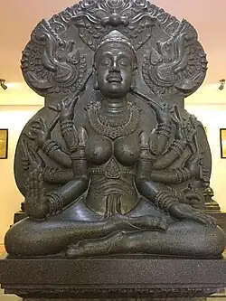 According to Cham folk legends, Champa was founded by Lady Po Nagar–the divine mother goddess of the kingdom. She came from the Moon, arrived in modern Central Vietnam and founded the kingdom, but a typhoon drifted her away and left her stranded on the coast of China, where she married a Chinese prince, and returned to Champa. The Po Nagar temple built in Nha Trang during the 8th century, and rebuilt in the 11th century was dedicated to her. Her portrayal image in the temple is said to date from 965, it is of a commanding personage seated cross-legged upon a throne.[28] She is also worshiped by the Vietnamese, a tradition that dates back to the 11th century during the Ly dynasty period.[29]