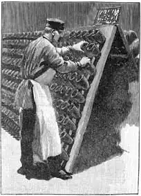 Le Remueur: 1889 engraving of the man engaged in the daily task of turning each bottle a fraction