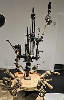 Dom Pérignon was originally charged by his superiors at the Abbey of Hautvillers to get rid of the bubbles since the pressure in the bottles caused many of them to burst in the cellar.[30] As sparkling wine production increased in the early 18th century, cellar workers had to wear a heavy iron mask to prevent injury from spontaneously bursting bottles. The disturbance caused by one bottle exploding could cause a chain reaction, with it being routine for cellars to lose 20–90% of their bottles this way. The mysterious circumstance surrounding the then unknown process of fermentation and carbonic gas caused some critics to call the sparkling creations "The Devil's Wine".[31]