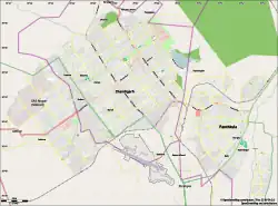 Mayer produced a fan-shaped plan, spreading southward between the Patiala-ki-rao and Sukhna Cho streams, with the capitol located on a promontory in Sukhna's fork at the upper margin, a university at the very north, a railway station to the east, an industrial area to the southeast and a commercial block in the center.[55] The city was to be made up of several neighbourhood units, or superblocks, arranged in districts of various shapes roughly one-by-half kilometre in size, each containing residences, bazaar, schools, parks, health centres, theatres and meeting halls.[56] The superblocks were to be arranged in a curvilinear street layout with adequate road space for future motor traffic.[56] Mayer’s plan was based on the ideals of the Garden City movement and the Radburn idea.[57] [58]