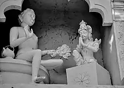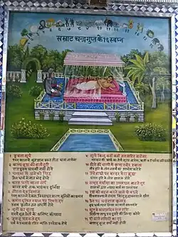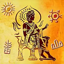 Buddhist texts such as Mahavamsa describe Chandragupta to be of Kshatriya origin.[28] These sources, written about seven centuries after his dynasty ended, state that both Chandragupta and his grandson Ashoka – a patron of Buddhism – were Moriyas, a branch of Gautama Buddha's Shakya noble family.[29] These Buddhist sources attempt to link the dynasty of their patron Ashoka directly to the Buddha.[30] The sources claim that the family branched off to escape persecution from a King of Kosala and Chandragupta's ancestors moved into a secluded Himalayan kingdom known for its peacocks. The Buddhist sources explain the epithet maurya comes from these peacocks, or Mora in Pali (Sanskrit: Mayura).[29][1] The Buddhist texts are inconsistent; some offer other legends to explain his epithet. For example, they mention a city named "Moriya-nagara" where all buildings were made of bricks colored like the peacock's neck.[31] The Maha-bodhi-vasa states he hailed from Moriya-nagara, while the Digha-Nikaya states he came from the Maurya clan of Pipphalivana.[28] The Buddhist sources also mention that "Brahmin Chanakya" was his counselor and with whose support Chandragupta became the king at Patliputra.[31] He has also been variously identified with Shashigupta (which has same etymology as of Chandragupta) of Paropamisadae on the account of same life events.[32]