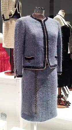 After the First World War, La Maison Chanel, following the fashion trends of the 1920s, produced beaded dresses made popular by Flapper women.[4] The simple-line, 'flat-chested' fashions Chanel couture made popular were opposite of the hourglass figure fashions of the late 19th century – the Belle Époque of France (c. 1890–1914), and the British Edwardian era (c. 1901–1919). Chanel used colors traditionally associated with masculinity in Europe, such as grey and navy blue, to denote feminine boldness.[6][8] Chanel clothing often featured quilted fabric and leather trimmings; the quilted construction reinforced the fabric, design, and finish, allowing the garment to maintain its form and function while worn. An example is the woolen Chanel suit – a knee-length skirt and a cardigan-style jacket, trimmed and decorated with black embroidery and gold-coloured buttons, often accessorized with two-tone pump shoes, a necklace of pearls, and a leather handbag.[4][6][9]