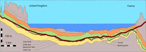 In 1881, British railway entrepreneur Sir Edward Watkin and Alexandre Lavalley, a contractor of the French Suez Canal Company, participated in the Anglo-French Submarine Railway Company, which conducted exploratory work on both sides of the Channel.[35][36] From June 1882 to March 1883, the British tunnel boring machine tunnelled, through chalk, a total of 1,840 metres (6,037 ft),[37] while Lavalley used a similar machine to drill 1,669 m (5,476 ft) from Sangatte on the French side.[38] However, the cross-Channel tunnel project was abandoned in 1883, despite this success, after fears raised by the British military that an underwater tunnel might be used as an invasion route.[37][39] Nevertheless, in 1883, this TBM was used to bore a railway ventilation tunnel—7 ft (2.1 m) in diameter and 6,750 ft (2,060 m) long—between Birkenhead and Liverpool, England, through sandstone under the River Mersey.[40] These early works were encountered more than a century later during the TransManche Link (TML) project.