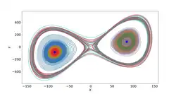 In more mathematical terms, the Lyapunov exponent measures the sensitivity to initial conditions, in the form of rate of exponential divergence from the perturbed initial conditions.[31] More specifically, given two starting trajectories in the phase space that are infinitesimally close, with initial separation , the two trajectories end up diverging at a rate given by