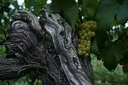 Due to some ampelographical similarities, Pinot blanc and Chardonnay were often mistaken for each other and even today share many of the same synonyms. The grape vines, leaves, and clusters look identical at first glance, but some subtle differences are seen. The most visible of these can be observed as the grapes are ripening, with Chardonnay grapes taking on a more golden-green color than Pinot blanc grapes. On closer inspection, the grapevine shows slight differences in the texture and length of the hairs on the vine's shoot, and the veins of a Chardonnay leaf are "naked" near the petiolar sinus – the open area where the leaf connects to the stem is delineated by veins at the edge.[8] Cabernet Sauvignon is one of the few other Vitis vinifera grape vines to share this characteristic.[13] This confusion between Pinot blanc and Chardonnay was very pervasive throughout northern Italy, where the two vines grew interspersed in the vineyard and were blended in winemaking. The Italian government did not dispatch researchers to try to distinguish the two vines until 1978. A similar situation occurred in France, with the two vines being commonly confused until the mid-19th century, when ampelographers began combing through the vineyards of Chablis and Burgundy, identifying the true Chardonnay and weeding out the Pinot blanc.[8]