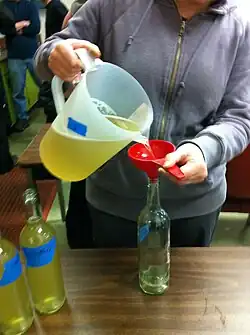 Other winemaking decisions that can have a significant effect include the temperature of fermentation and what time, if any, that the wine allowed to spend aging on the lees. Burgundian winemaking tends to favor extended contact on the lees and even "stirring up" the lees within the wine while it is aging in the barrel in a process known as bâtonnage. Colder fermentation temperatures produce more "tropical" fruit flavors like mango and pineapple.[8] The "Old World" style of winemaking favors the use of wild, or ambient yeast, though some will also use specially cultivated yeast that can impart aromatic qualities to the wine. A particular style of yeast used in Champagne is the Prise de Mousse that is cultivated for use worldwide in sparkling Chardonnay wines. A potential drawback of using wild yeast is that the fermentation process can go very slowly with the results of the yeasts being very unpredictable and producing potentially a very different wine each year. One Burgundian winemaker that favors the use of only wild yeast is Domaine des Comtes Lafon which had the fermentation of its 1963 Chardonnay batch take five years to complete when the fermentation process normally only takes a matter of weeks.[8]