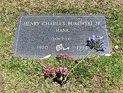 Bukowski died of leukemia on March 9, 1994, in San Pedro, aged 73, shortly after completing his last novel, Pulp.[39] The funeral rites, orchestrated by his widow, were conducted by Buddhist monks. He is interred at Green Hills Memorial Park in Rancho Palos Verdes. An account of the proceedings can be found in Gerald Locklin's book Charles Bukowski: A Sure Bet. His gravestone reads: "Don't Try", a phrase which Bukowski uses in one of his poems, advising aspiring writers and poets about inspiration and creativity. Bukowski explained the phrase in a 1963 letter to John William Corrington: "Somebody at one of these places [...] asked me: 'What do you do? How do you write, create?' You don't, I told them. You don't try. That's very important: not to try, either for Cadillacs, creation or immortality. You wait, and if nothing happens, you wait some more. It's like a bug high on the wall. You wait for it to come to you. When it gets close enough you reach out, slap out and kill it. Or, if you like its looks, you make a pet out of it."