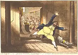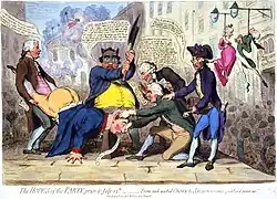 Fox, however, had not been present in the House of parliament for the beginning of the Dunning debate, as he had been occupied in the adjoining eleventh-century Westminster Hall, serving as chairman of a mass public meeting before a large banner that read "Annual Parliaments and Equal Representation".[18] This was the period when Fox, hardening against the influence of the British Crown, was embraced by the radical movement of the late eighteenth century. When the shocking Gordon riots exploded in London in June 1780, Fox, though deploring the violence of the crowd, declared that he would "much rather be governed by a mob than a standing army."[19] Later, in July, Fox was returned for the populous and prestigious parliamentary constituency of Westminster, with around 12,000 electors, and acquired the title "Man of the People".[3]