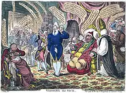 Fox, however, was incommunicado in Italy as the crisis broke; he had resolved not to read any newspapers while he was abroad, except the racing reports.[34] Three weeks passed before he returned to Britain on 25 November 1788, and then he was taken seriously ill (partly due to the stress of his rapid journey across Europe). He would not recover entirely until December 1789. He again absented himself to Bath from 27 January to 21 February 1789.[35]