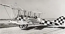 Lindbergh left flying with the onset of winter and returned to his father's home in Minnesota.[24] His return to the air and his first solo flight did not come until half a year later in May 1923 at Souther Field in Americus, Georgia, a former Army flight-training field, where he bought a World War I surplus Curtiss JN-4 "Jenny" biplane for $500. Although Lindbergh had not touched an airplane in more than six months, he had already secretly decided that he was ready to take to the air by himself. After a half-hour of dual time with a pilot who was visiting the field, Lindbergh flew solo for the first time in the Jenny.[25][26] After spending another week or so at the field to "practice" (thereby acquiring five hours of "pilot in command" time), Lindbergh took off from Americus for Montgomery, Alabama, some 140 miles (230 km) to the west, for his first solo cross-country flight.[27] Lindbergh went on to spend much of the remainder of 1923 engaged in almost nonstop barnstorming under the name "Daredevil Lindbergh", this time flying in his "own ship" as the pilot.[28][29] A few weeks after leaving Americus, he made his first night flight near Lake Village, Arkansas.[30]