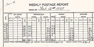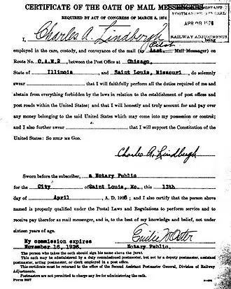 On April 13, 1926, Lindbergh executed the United States Post Office Department's Oath of Mail Messengers,[40] and two days later, he opened service on the new route. On two occasions, combinations of bad weather, equipment failure, and fuel exhaustion forced Lindbergh to bail out on night approach to Chicago;[41][42] both times he reached the ground without serious injury.[42][43] In mid-February 1927, Lindbergh left for San Diego, California, to oversee design and construction of the Spirit of St. Louis.[44]