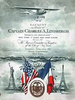 The following night, Lindbergh was honored with a grand banquet at the Hotel Commodore given by the Mayor's Committee on Receptions of the City of New York and attended by some 3,700 people.[115] He was officially awarded the check for the prize on June 16.[85]