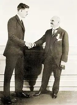 Lindbergh flew from Washington, D.C., to New York City on June 13, arriving in Lower Manhattan. He traveled up the Canyon of Heroes to City Hall, where he was received by Mayor Jimmy Walker. A ticker-tape parade[109] followed to Central Park Mall, where he was awarded the New York Medal for Valor at a ceremony hosted by New York Governor Al Smith and attended by a crowd of 200,000. Some 4,000,000 people saw Lindbergh that day.[110][111][112][113] That evening, Lindbergh was accompanied by his mother and Mayor Walker when he was the guest of honor at a 500-guest banquet and dance held at Clarence MacKay's Long Island estate, Harbor Hill.[114]