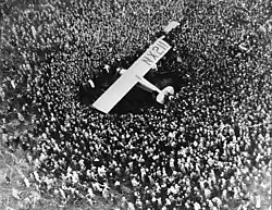 A crowd estimated at 150,000 stormed the field, dragged Lindbergh out of the cockpit, and carried him around above their heads for "nearly half an hour."[80] Some minor damage was done to the Spirit by souvenir hunters before pilot and plane reached the safety of a nearby hangar with the aid of French military fliers, soldiers, and police.[80] The Times reported that before the police could intervene the "souvenir mad" spectators "stripped the plane of everything which could be taken off", and were cutting off pieces of linen when "a squad of soldiers with fixed bayonets quickly surrounded" the plane, providing guard as it was "wheeled into a shed."[78] Lindbergh met the U.S. Ambassador to France, Myron T. Herrick, across Le Bourget field in a "little room with a few chairs and an army cot."[81] The lights in the room were turned off to conceal his presence from the frenzied crowd, which "surged madly" trying to find him. Lindbergh shook hands with Herrick and handed him several letters he had carried across the Atlantic, three of which were from Col. Theodore Roosevelt Jr., son of former President Theodore Roosevelt, who had written letters of introduction at Lindbergh's request.[82][81] Lindbergh left the airfield around midnight and was driven through Paris to the ambassador's residence, stopping to visit the French Tomb of the Unknown Soldier at the Arc de Triomphe;[81] after arriving at the residence, he slept for the first time in about 60 hours.[78][72][68]