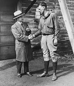 The morning after landing, Lindbergh appeared in the balcony of the U.S. embassy, responding "briefly and modestly" to the calls of the crowd.[90] The French Foreign Office flew the American flag, the first time it had saluted someone who was not a head of state.[91] At the Élysée Palace, French President Gaston Doumergue bestowed the Légion d'honneur on Lindbergh, pinning the award on his lapel, with Ambassador Herrick present for the occasion.[92][93][94] Lindbergh also made flights to Belgium and Britain in the Spirit before returning to the United States. On May 28, Lindbergh flew to Evere Aerodrome in Brussels, Belgium, circling the field three times for the cheering crowd and taxiing to a halt just after 3:00 PM, as a thousand children waved American flags.[95] On his way to Evere, Lindbergh had met an escort of ten planes from the airport, who found him on course near Mons but had trouble keeping up as the Spirit was averaging "about 100 miles an hour."[95] After landing, Lindbergh was welcomed by military officers and prominent officials, including Belgian Prime Minister Henri Jaspar, who led the procession of Lindbergh's plane to a "platform where it was raised to the view of cheering thousands."[95] "It was a splendid flight," Lindbergh declared, stating: "I enjoyed every minute of it. The motor is in fine shape and I could circle Europe without touching it."[95] Belgian troops with fixed bayonets protected the Spirit to avoid a repeat of the damage at Le Bourget.[95] From Evere, Lindbergh motored to the U.S. embassy, and then went to place a wreath on the Belgian tomb of the unknown soldier.[95] He then visited the Belgian royal palace at the invitation of King Albert I, where the king made Lindbergh a Knight of the Order of Leopold; as Lindbergh shook the king's hand, he said: "I have heard much of the famous soldier-king of the Belgians."[95][96] The United Press reported that "One million persons are in Brussels today to greet Lindbergh", constituting "the greatest welcome ever accorded a private citizen in Belgium."[95]