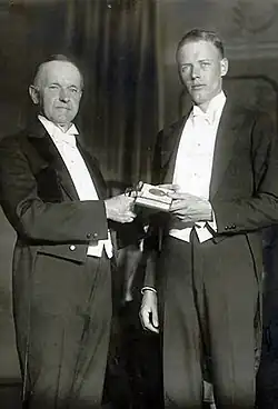 On December 14, 1927, a Special Act of Congress awarded Lindbergh the Medal of Honor, despite the fact that it was almost always awarded for heroism in combat.[117] It was presented to Lindbergh by President Coolidge at the White House on March 21, 1928.[118] The medal contradicted Coolidge's earlier executive order directing that "not more than one of the several decorations authorized by Federal law will be awarded for the same act of heroism or extraordinary achievement" (Lindbergh was recognized for the same act with both the Medal of Honor and the Distinguished Flying Cross).[119] The statute authorizing the award was also criticized for apparently violating procedure; House legislators reportedly neglected to have their votes counted.[120]