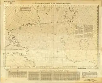 At around 9:52 AM New York time, or 27 hours after he left Roosevelt Field, Lindbergh saw "porpoises and fishing boats", a sign he had reached the other side of the Atlantic.[67][72] Lindbergh circled and flew closely, but no fishermen appeared on the boat decks, although he did see a face watching from a porthole.[67][62] Dingle Bay, in County Kerry of southwest Ireland, was the first European land that Lindbergh encountered; he veered to get a better look and consulted his charts, identifying it as the southern tip of Ireland.[73][69][67] The local time in Ireland was 3:00 PM.[68] Flying over Dingle Bay, the Spirit was "2.5 hours ahead of schedule and less than 3 miles (5 km) off course."[68] Lindbergh had navigated "almost precisely to the coastal point he had marked on his chart."[62] Lindbergh wanted to reach the French coast in daylight, so increased his speed to 110 miles per hour (180 km/h).[68] The English coast appeared ahead of him, and he was "now wide awake."[67] A report came from Plymouth, on the English coast, that Lindbergh's plane had started across the English Channel.[62] News soon spread across both "Europe and the United States that Lindbergh had been spotted over England", and a crowd started to form at Le Bourget Aerodrome as he neared Paris.[72] At sunset, he flew over Cherbourg, on the French coast 200 miles (320 km) from Paris; it was around 2:52 PM New York time.[68][67]