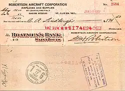 Financing the historic flight was a challenge due to Lindbergh's obscurity, but two St. Louis businessmen eventually obtained a $15,000 bank loan. Lindbergh contributed $2,000 (equivalent to $36,000 in 2024)[51] of his own money from his salary as an air mail pilot and another $1,000 was donated by RAC. The total of $18,000 was far less than what was available to Lindbergh's rivals.[52]