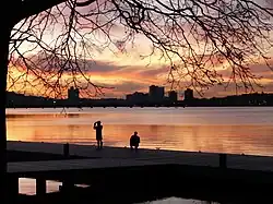 As sewage, industrial wastewater and urban runoff flowed freely into the river from the surrounding city, the Charles River became well known for its high level of pollutants, gaining such notoriety that by 1955, Bernard DeVoto wrote in Harper's Magazine that the Charles was "foul and noisome, polluted by offal and industrious wastes, scummy with oil, unlikely to be mistaken for water."[23] Fish kills and submerged vehicles were a common sight, along with toxic chemical plumes that colored parts of the river pink and orange.[24] The Standells sang about the sorry state of the Charles in their 1965 song "Dirty Water".