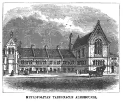 On the almshouses: "WE GREATLY NEED AT LEAST £5000 TO ENDOW THE ALMHOUSES, AND PLACE THE INSTITUTION UPON A PROPER FOOTING. Already C. H. Spurgeon, Thomas Olney, and Thomas Greenwood have contributed £200 each towards the fund, and we earnestly trust that either by donations or legacies the rest of the £5000 will be forthcoming."[41]