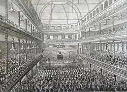 a congregation consisting of 10,000 souls, streaming into the hall, mounting the galleries, humming, buzzing, and swarming – a mighty hive of bees – eager to secure at first the best places, and, at last, any place at all. After waiting for more than half an hour – for if you wish to have a seat you must be there at least that space of time in advance… Mr. Spurgeon ascended his tribune. To the hum, rush, and trampling of men, succeeded a low, concentrated thrill and murmur of devotion, which seemed to run at once, like an electric current, through the breast of everyone present, and by this magnetic chain the preacher held us fast bound for about two hours. It is not my purpose to give a summary of his discourse. It is enough to say of his voice, that its power and volume are sufficient to reach everyone in that vast assembly; of his language that it is neither high-flown nor homely; of his style, that it is at times familiar, at times declamatory, but always happy, and often eloquent; of his doctrine, that neither the 'Calvinist' nor the 'Baptist' appears in the forefront of the battle which is waged by Mr. Spurgeon with relentless animosity, and with Gospel weapons, against irreligion, cant, hypocrisy, pride, and those secret bosom-sins which so easily beset a man in daily life; and to sum up all in a word, it is enough to say, of the man himself, that he impresses you with a perfect conviction of his sincerity.[13]