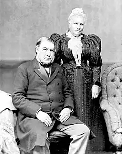 Returning to Nova Scotia in 1846, he broke off an engagement that he had contracted at age 17 with the daughter of a wealthy Halifax merchant, and instead married Frances Morse (1826–1912), the granddaughter of Colonel Joseph Morse, a founder of Amherst, Nova Scotia.[8][6] The Tuppers had three sons (Orin Stewart, Charles Hibbert, and William Johnston) and three daughters (Emma, Elizabeth Stewart (Lilly), and Sophy Almon).[6] The Tupper children were raised in Frances's Anglican denomination and Charles and Frances regularly worshipped in an Anglican church, though on the campaign trail, Tupper often found time to visit Baptist meetinghouses.[6]