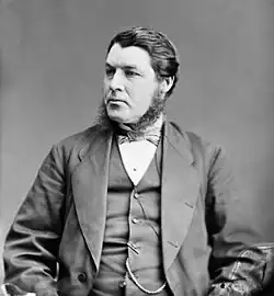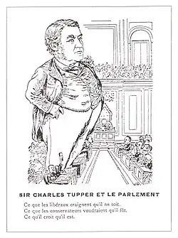 Though Macdonald stayed on as Conservative leader, Tupper now assumed a more prominent role in the Conservative Party and was widely seen as Macdonald's heir apparent.[6] He led Conservative attacks on the Mackenzie government throughout the 3rd Parliament.[6] The Mackenzie government attempted to negotiate a new free trade agreement with the United States to replace the Canadian–American Reciprocity Treaty which the U.S. had abrogated in 1864.[6] When Mackenzie proved unable to achieve reciprocity, Tupper began shifting toward protectionism and became a proponent of the National Policy which became a part of the Conservative platform in 1876.[6] The sincerity of Tupper's conversion to the protectionist cause was doubted at the time, however: according to one apocryphal story, when Tupper came to the 1876 debate on Finance Minister Richard John Cartwright's budget, he was prepared to advocate free trade if Cartwright had announced that the Liberals had shifted their position and were now supporting protectionism.[6]