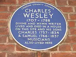 Only three of the couple's children survived infancy: Charles Wesley junior (1757–1834), Sarah Wesley (1759–1828), who like her mother was also known as Sally, and Samuel Wesley (1766–1837).[14] Their other children, John, Martha Maria, Susannah, Selina and John James are all buried in Bristol, having died between 1753 and 1768. (See monument in garden on north side of junction of Lewis Mead and The Haymarket, Bristol.) Both Samuel and Charles junior were musical child prodigies and, like their father, became organists and composers. Charles junior spent most of his career as the personal organist of the Royal Family, and Samuel became one of the most accomplished musicians in the world and is often called "the English Mozart".[15] Samuel Wesley's son, Samuel Sebastian Wesley, was one of the foremost British composers of the 19th century.[14]