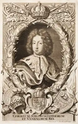 Charles XI or Carl (Swedish: Karl XI; 4 December [O.S. 24 November] 1655 – 15 April [O.S. 5 April] 1697)[2] was King of Sweden from 1660 until his death in 1697.