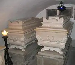 Upon the death of the Austrian emperor Francis in March 1835, the Bourbons left Prague Castle, as the new emperor Ferdinand wished to use it for coronation ceremonies. The Bourbons moved initially to Teplitz. Then, as Ferdinand continued his use of Prague Castle, Kirchberg Castle was purchased for them. Moving there was postponed due to an outbreak of cholera in the locality.[66] In the meantime, Charles left for the warmer climate on Austria's Mediterranean coast in October 1835. Upon his arrival at Görz (Gorizia) in the Kingdom of Illyria, he caught cholera and died on 6 November 1836.[37] The townspeople draped their windows in black mourning. Charles was interred in the Church of the Annunciation of Our Lady, in the Franciscan Kostanjevica Monastery (now in Nova Gorica, Slovenia), where his remains lie in a crypt with those of his family.[66] He is the only King of France to be buried outside the country.[67][68] A movement reportedly began in 2016 advocating for Charles X's remains to be buried along with other French monarchs in the Basilica of St Denis,[67][68] although Louis Alphonse, current head of the House of Bourbon, stated in 2017 that he wished the remains of his ancestors to lie undisturbed.[69]