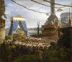 Louis XVIII was greeted with great rejoicing from the Parisians and proceeded to occupy the Tuileries Palace.[28] The Count of Artois lived in the Pavillon de Mars, and the Duke of Angoulême in the Pavillon de Flore, which overlooked the River Seine.[29] The Duchess of Angoulême fainted upon arriving at the palace, as it brought back terrible memories of her family's incarceration there, and of the storming of the palace and the massacre of the Swiss Guards on 10 August 1792.[28]