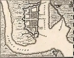 King Charles II granted the chartered Province of Carolina to eight of his loyal friends, known as the Lords Proprietors, on March 24, 1663. In 1670, Governor William Sayle arranged for several shiploads of settlers from Bermuda and Barbados.[17][18] These settlers established what was then called Charles Town at Albemarle Point, on the west bank of the Ashley River, a few miles northwest of the present-day city center.[19][20] Charles Town became the first comprehensively planned town in the Thirteen Colonies. Its governance, settlement, and development were to follow a visionary plan known as the Grand Model prepared for the Lord's Proprietors by John Locke.[21] Because the Carolina's Fundamental Constitutions was never ratified, however, Charles Town was never incorporated during the colonial period. Instead, local ordinances were passed by the provincial government, with day-to-day administration handled by the wardens and vestries of St Philip's and St Michael's Anglican parishes.[20]