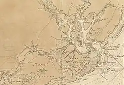 The initial settlement quickly dwindled and disappeared while another village—established by the settlers on Oyster Point at the confluence of the Ashley and Cooper rivers around 1672[20]—thrived. In 1680, this second settlement formally replaced the original Charles Town,[23] which today is commemorated as Charles Towne Landing. The second location was more defensible and had access to a fine natural harbor. The new town had become the fifth largest in North America by 1690.[24]