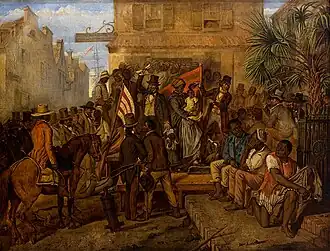 Throughout this period, enslaved people were sold aboard the arriving ships or at ad hoc gatherings in the town's taverns.[37] Runaways and minor slave rebellions prompted the 1739 Security Act, which required all white men to carry weapons at all times (even to church on Sundays). Before it fully took effect, the Cato or Stono Rebellion broke out. The white community had recently been decimated by a malaria outbreak, and the rebels killed about 25 white people before being stopped by the colonial militia. As a result of their fears of rebellion, whites killed a total of 35 to 50 Black people.[38][39]
