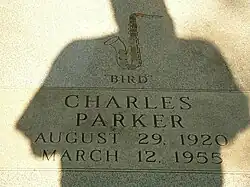 Parker's marital status complicated the settling of Parker's estate and ultimately frustrated his wish to be interred in New York City.[56] Dizzy Gillespie paid for the funeral arrangements,[57] which included a Harlem procession officiated by Congressman and Reverend Adam Clayton Powell Jr. at the Abyssinian Baptist Church[56] and a memorial concert. Parker's body was flown back to Missouri, in accordance with his mother's wishes. Chan criticized Doris and Parker's family for giving him a Christian funeral even though they knew he was an atheist.[58] Parker was buried at Lincoln Cemetery in Missouri, in a hamlet known as Blue Summit, located close to I-435 and East Truman Road.[59]