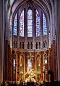 Relatively few changes were made after this time. An additional seven spires were proposed in the original plans, but these were never built.[11] In 1326, a new two-storey chapel, dedicated to Saint Piatus of Tournai, displaying his relics, was added to the apse. The upper floor of this chapel was accessed by a staircase opening onto the ambulatory. (The chapel is normally closed to visitors, although it occasionally houses temporary exhibitions.) Another chapel was opened in 1417 by Louis, Count of Vendôme, who had been captured by the English at the Battle of Agincourt and fought alongside Joan of Arc at the siege of Orléans. It is located in the fifth bay of the south aisle and is dedicated to the Virgin Mary. Its highly ornate Flamboyant Gothic style contrasts with the earlier chapels.[11]