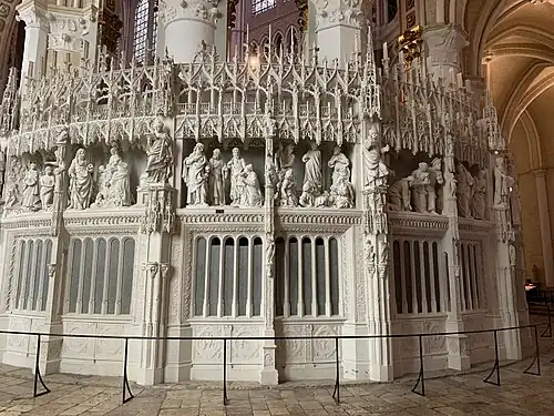 In 1753, further modifications were made to the interior to adapt it to new theological practices. The stone pillars were covered with stucco, and the tapestries which hung behind the stalls were replaced by marble reliefs. The rood screen that separated the liturgical choir from the nave was torn down and the present stalls were built. At the same time, some of the stained glass in the clerestory was removed and replaced with grisaille windows, greatly increasing the light on the high altar in the center of the church.